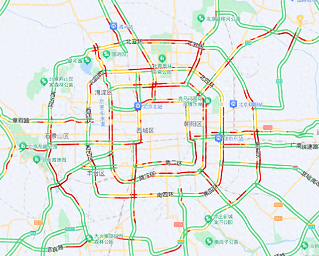 早高峰期间,北京城区东西部环路南向北、北部环路东向西方向,京藏、京承、京开、京港澳等高速公路进城方向易出现行驶缓慢。德胜门、马甸、苏州街、西便门等区域压力较大;阜石路、菜户营南路、西直门北大街、通惠河北路等联络线部分路段车流集中。