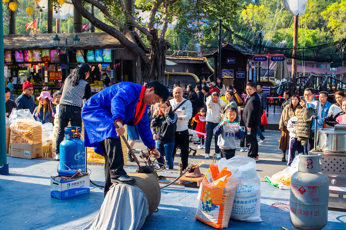 在隐贤山庄的新春活动中,游客们体验了一系列丰富多彩的传统节日庆典。从神秘的舞龙舞狮到充满地方特色的英歌舞,再到兼具创新与传统的电音三太子表演,每一项活动都让游客们感受到了浓浓的“年味”。还有新春庙街成为了游客体验传统美食和游乐的热点区域。传统小吃如打糍粑、炸油角、爆米花等美食让游客们大饱口福,而投壶、射箭等传统游艺则给予了游客互动的欢乐,使得每个人都能在新春的第一天留下美好的回忆。