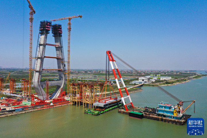 广州南中高速洪奇门特大桥主桥吊装架设首片钢箱梁施工现场(4月10日摄,无人机照片)。新华社记者 刘大伟 摄